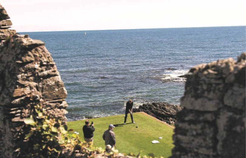 Notice the way they point away from the waves crashing against the rocks on the left of the fairway – and take the hint. In trying to find the tiny green on the first hole, many a half-decent drive has ended up sleeping with the fishes here.